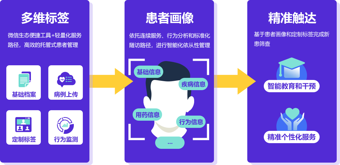 帮助医生开展托管式患者管理,基于患者画像进行高效率、低成本的患者触达和依从性管理